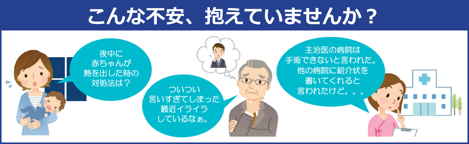 日常生活でのこころとからだの健康不安や病気の予防、治療のフォロー、育児・介護など、困ったときにはぜひご活用ください。