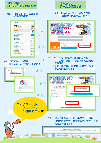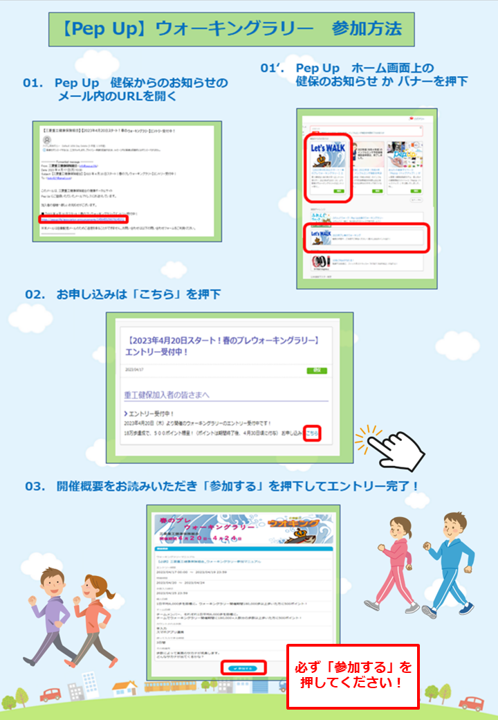 参加される方は「Pep Up」ホーム画面の『春のウォーキングラリー』開催のお知らせかウォーキングラリーのバナー、